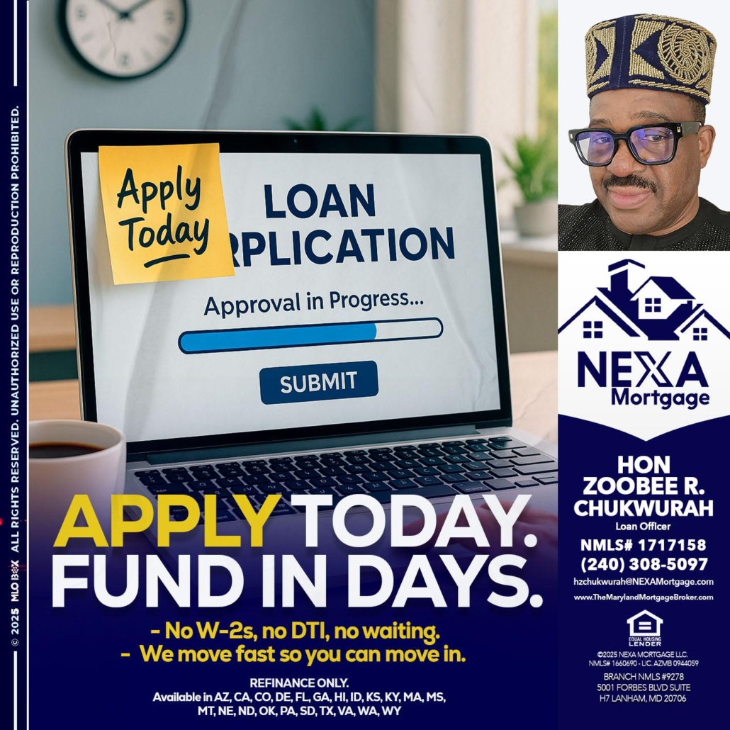 APPLY TODAY - Hon Zoobee R Chukwurah -Mortgage Loan OriginatorHi, my name is Hon Zoobee R Chukwurah. I’m a Loan Officer with NEXA Mortgage LLC., offering personalized mortgage solutions, fast customized quotes, great rates and service with integrity.